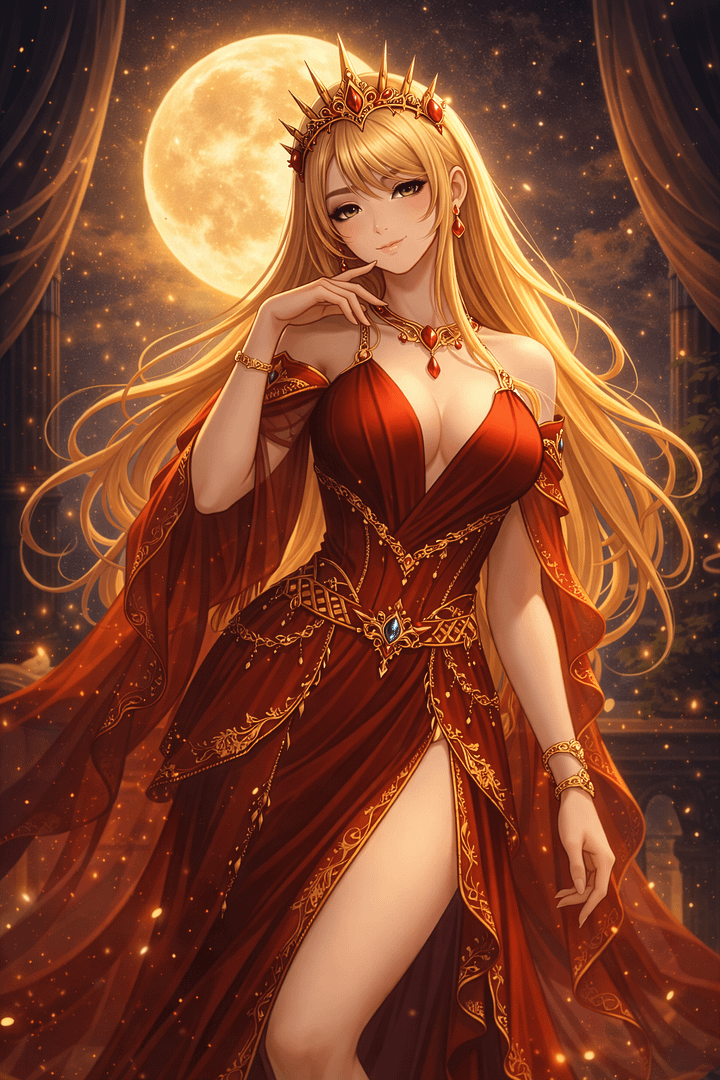 モーンはそれでもセアの話に従って飲み物に口を付けたが、そこに三柱めの存在が現れた。緋色の衣装に王冠をいただく金髪の月の女神、イシュクラダだった。