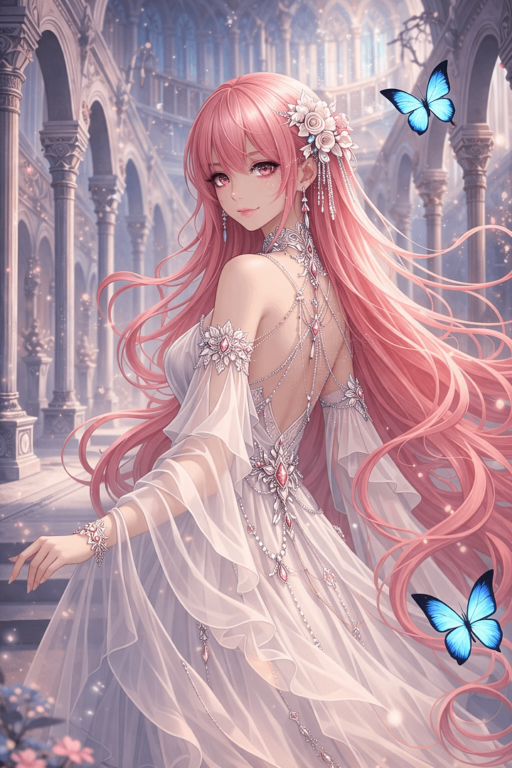 嘲りなのか親しみなのか分からない声色に、フードの人物は唇に笑みを浮かべてフードをはぎ、声の主の人影を見やる。薄く透けた純白のドレスと、大きく開いた輝くような背中、そして振り向くと同時に揺れる長い聴色(※桃色、ピンク色の一種)の髪。