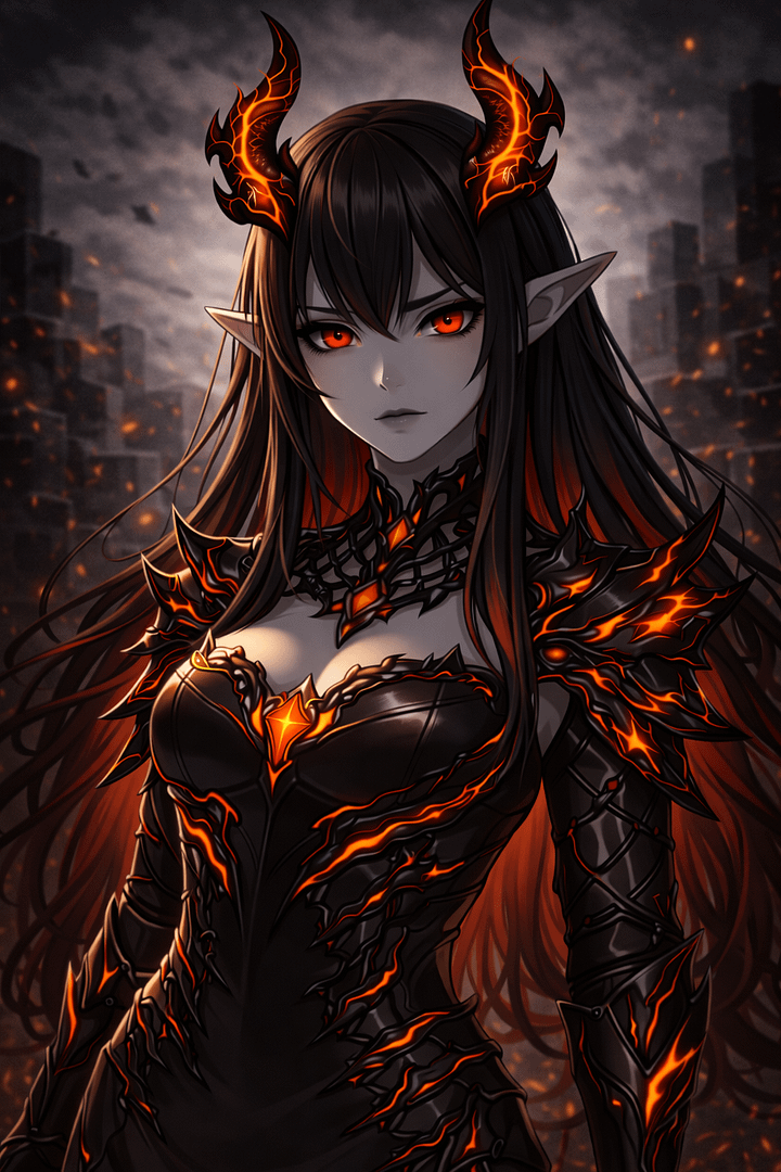 大婆の呼びかけと同時に、石の段に座っていた女がゆっくりと立ち上がった。青みがかった灰色の滑らかな肌と、きわめて豊満な肢体。炭のように黒い下着のような衣服は時折熾火が走るように燃え光り、その目と、長い黒髪の間から伸びた角の先も灼熱の赤を帯びている。それがひときわ強く赤く燃え輝き、照らされた肌にはどこかみずみずしさがあった。