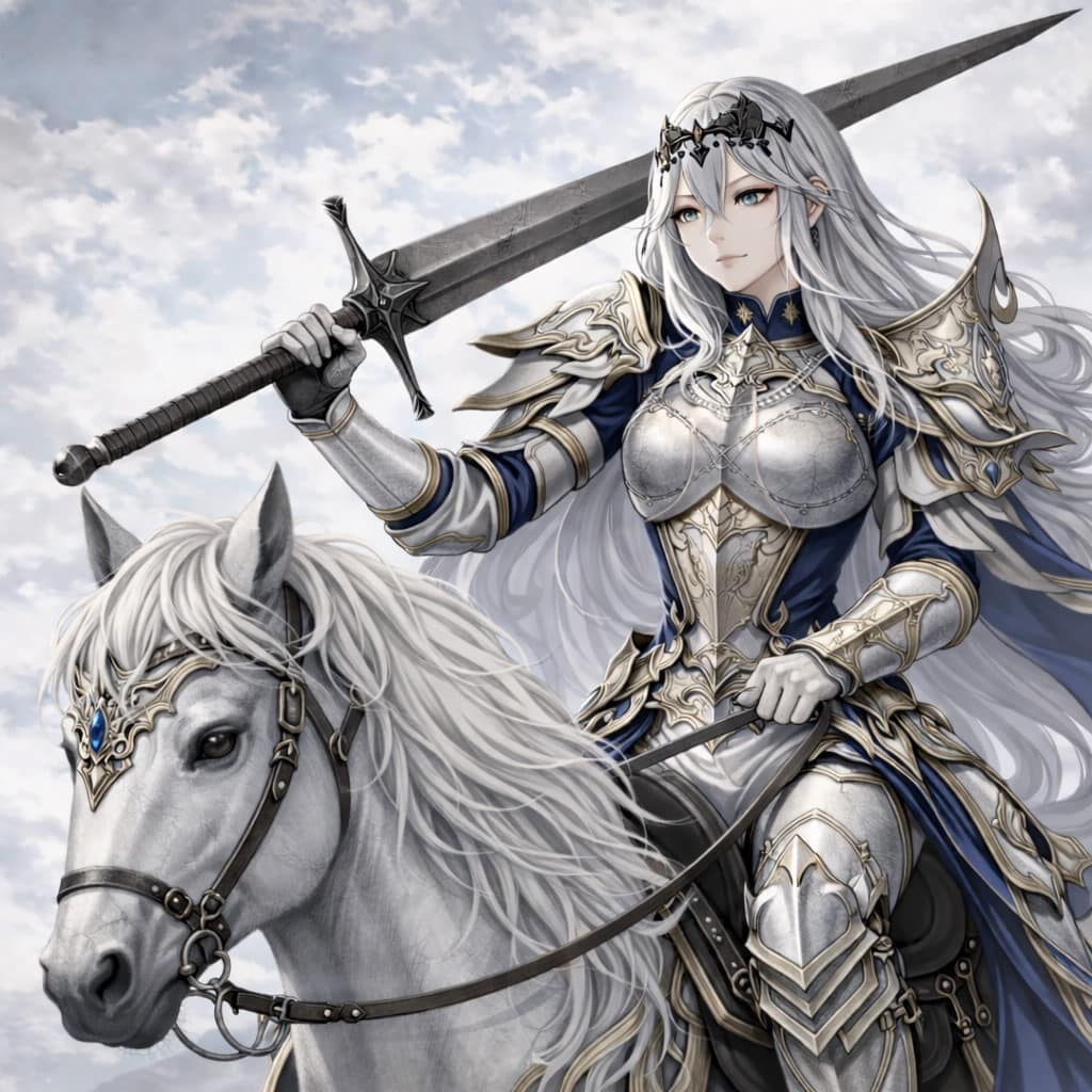 意味が分からない。全員が空を見やった。あり得ないことに銀毛の馬にまたがった輝ける甲冑姿の女騎士が空のただなかにおり、使い込まれた見事な大剣を抜きはらっている。