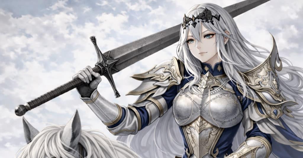意味が分からない。全員が空を見やった。あり得ないことに銀毛の馬にまたがった輝ける甲冑姿の女騎士が空のただなかにおり、使い込まれた見事な大剣を抜きはらっている。