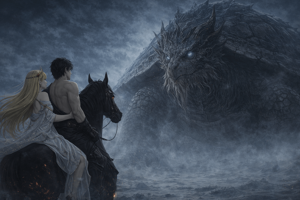 とてつもない変化をもたらした行いを、イシュクラダは何の気負いもなく説明している。遥か彼方にいるはずなのに、あまりに巨大で近くに見える亀は二人をじっと見つめていた。やがて、その大きな口が開き、頭や甲羅から虚無の砂がいくつもの滝のように流れ落ちた。