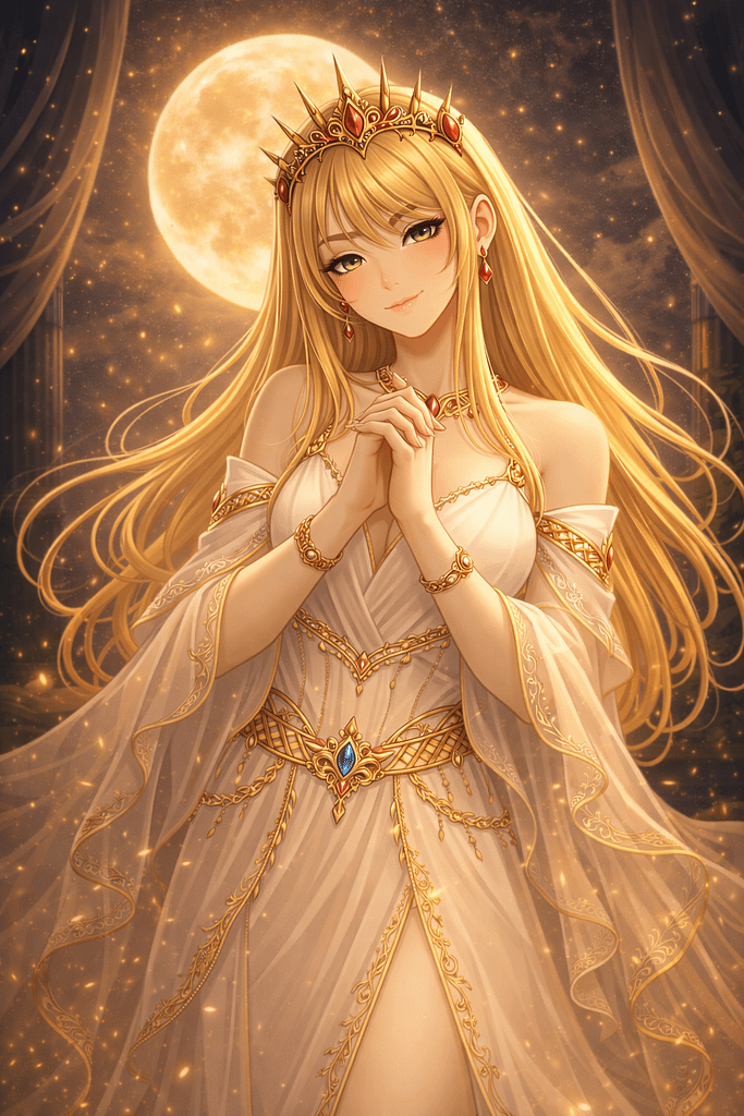 男はしばらく前に逆さまに伸びた塔の中で出会った絶美の女神を思い出していた。しかし、この永劫回帰獄には月に該当する天体はなく、念じるも何も無かろうとふと笑う。ところが、それが変化を呼び起こした。あたりを黄金めいた光がつつみ、見上げればその光源はかつて見た夏の月で、次に視線を落とせば透けたとばりが開いており、そこにあの月の女神が立っていた。
